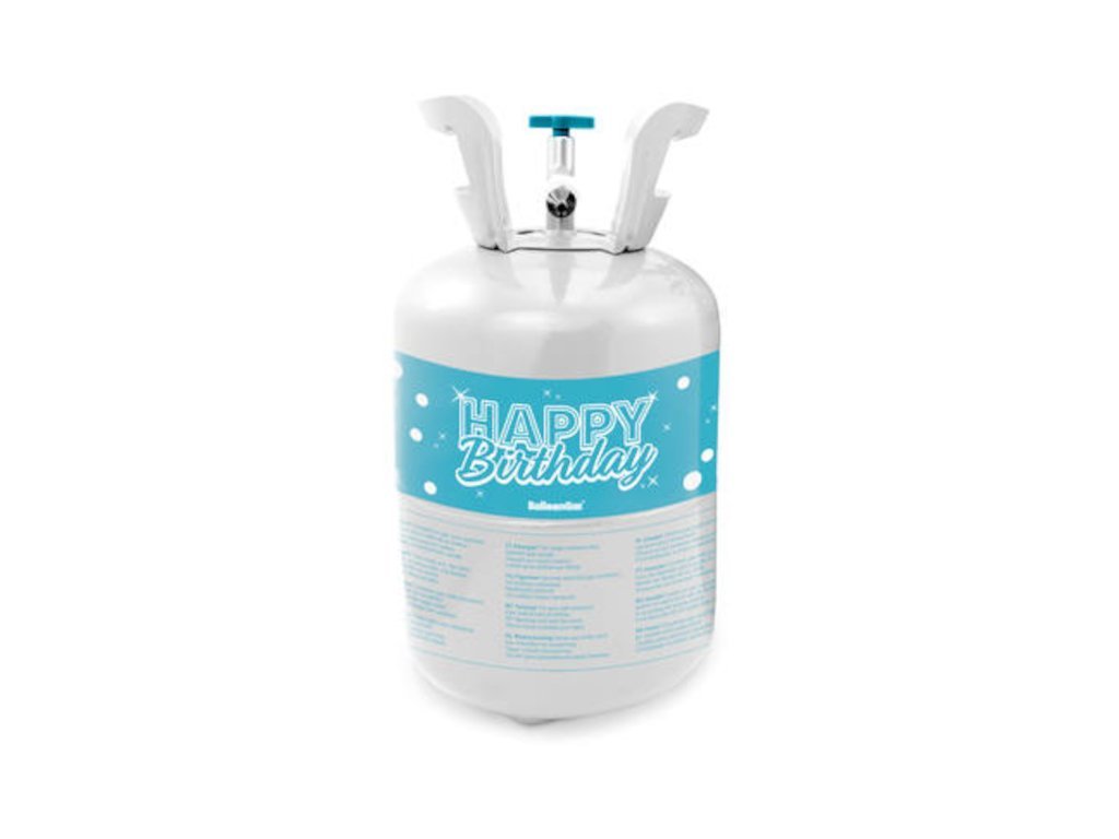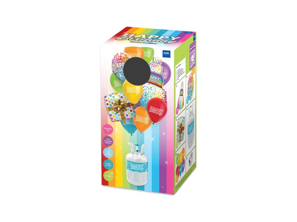 Sada tlakovej fľaše s héliom a 16 balónikmi pre domáce použitie, motív balónikov HAPPY BIRTHDAY, obsahuje 16 balónikov a stuhu na balóniky.