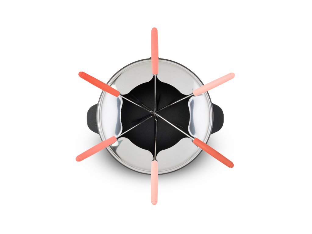 Súčasťou balenia je 6 farebne označených fondue vidličiek, takže každý ľahko spozná tú svoju. Praktický anti-splash krúžok pomáha zabrániť rozstreku a kovový stojan so 4 protišmykovými nožičkami zabezpečuje stabilitu pri používaní.