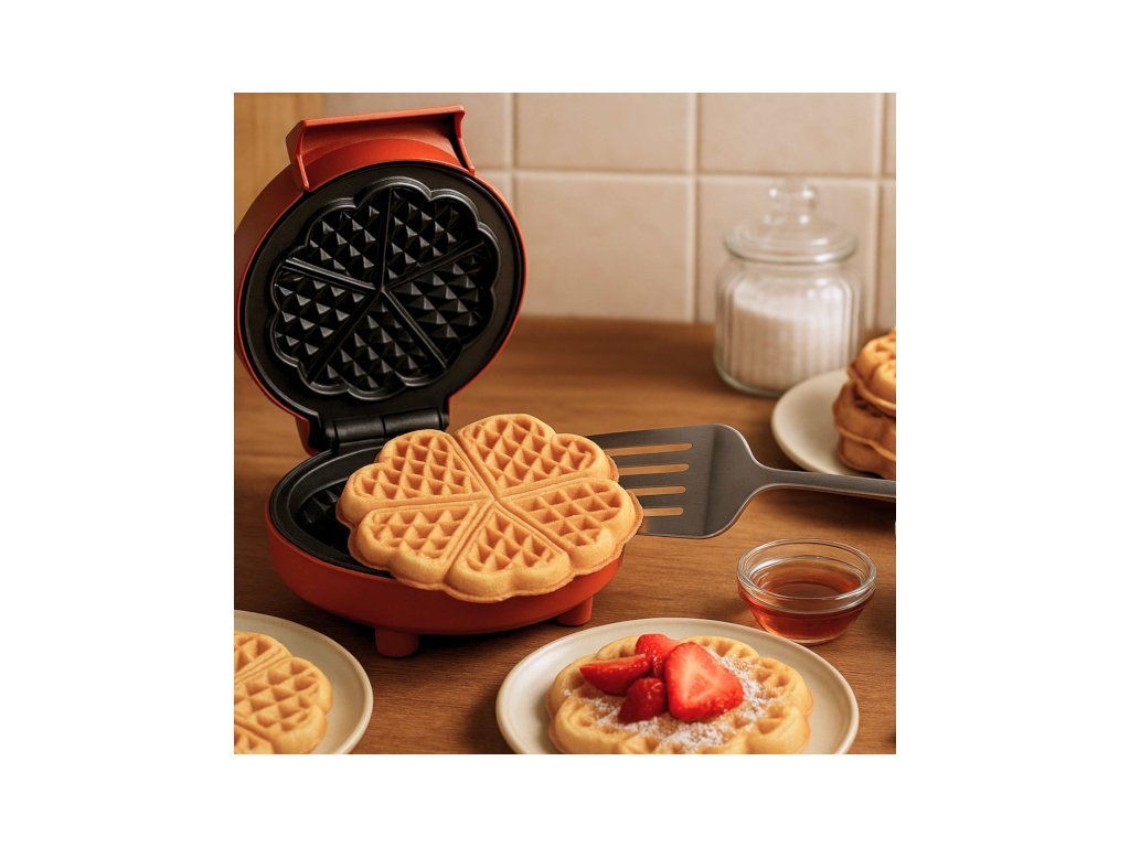 Elektrický vaflovač je ideálny pomocník na prípravu domácich vaflí v tvare srdca. Vďaka výkonu 1000 W sa rýchlo zahreje a umožňuje pripraviť až 5 srdiečkových vaflí naraz, takže je perfektný na rodinné raňajky, dezerty alebo sladké pohostenie pre návštevy.